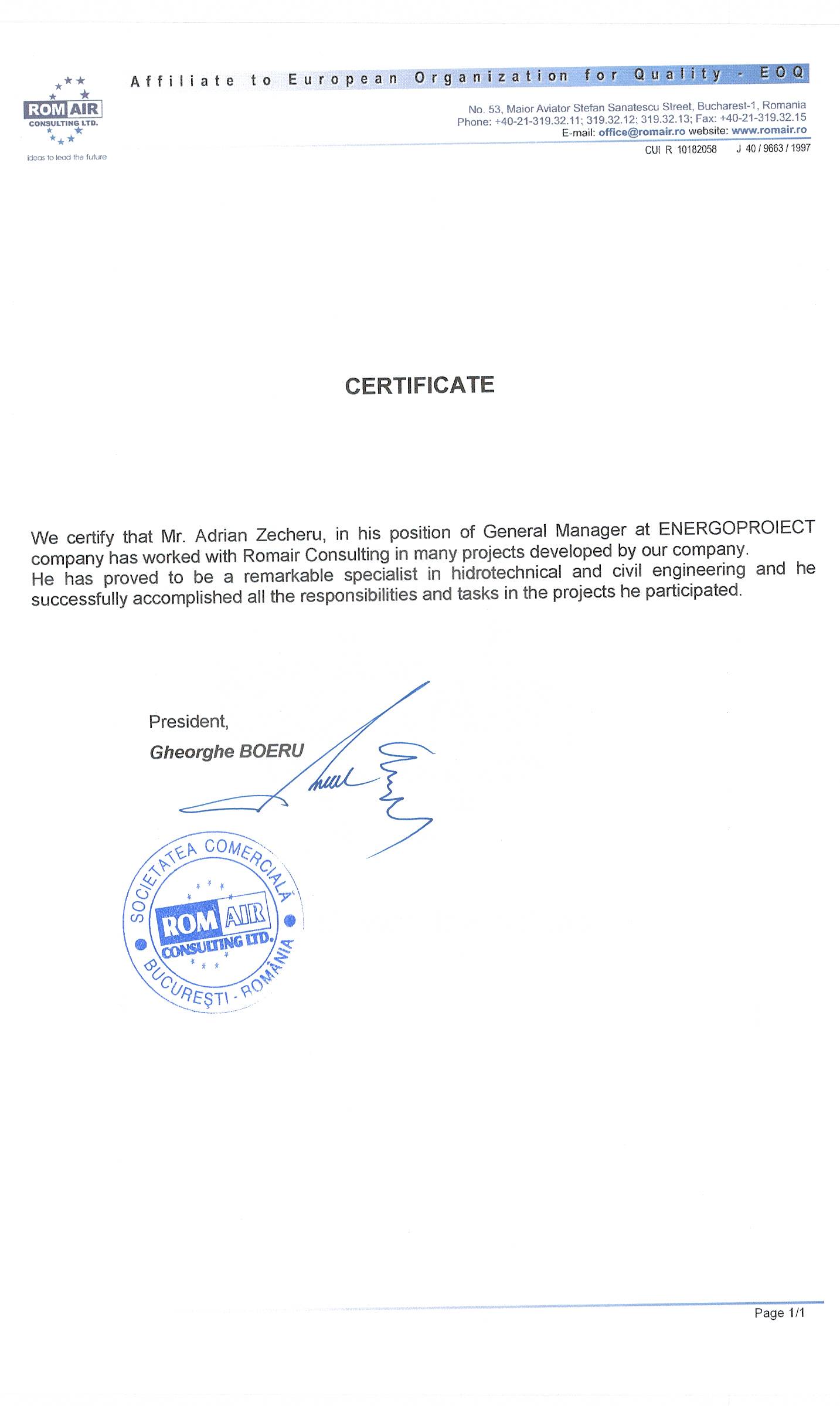 – Certificarea si mentinerea certificarii Sistemului de Management Integrat Calitate -Mediu – SSO in conformitate cu ISO 9001/2008 , SR EN ISO 14001:2005 si SR OHSAS 18001:2008.